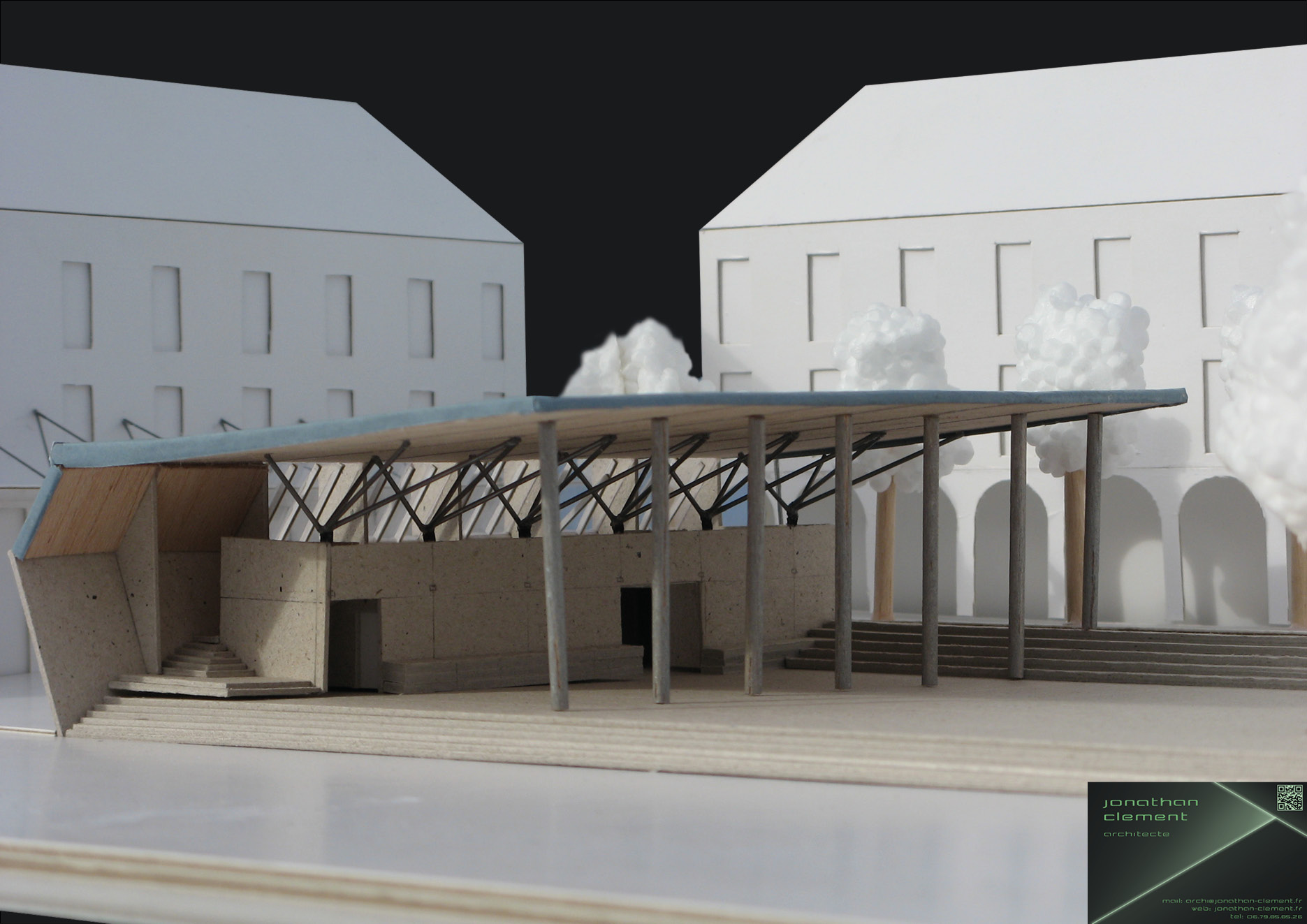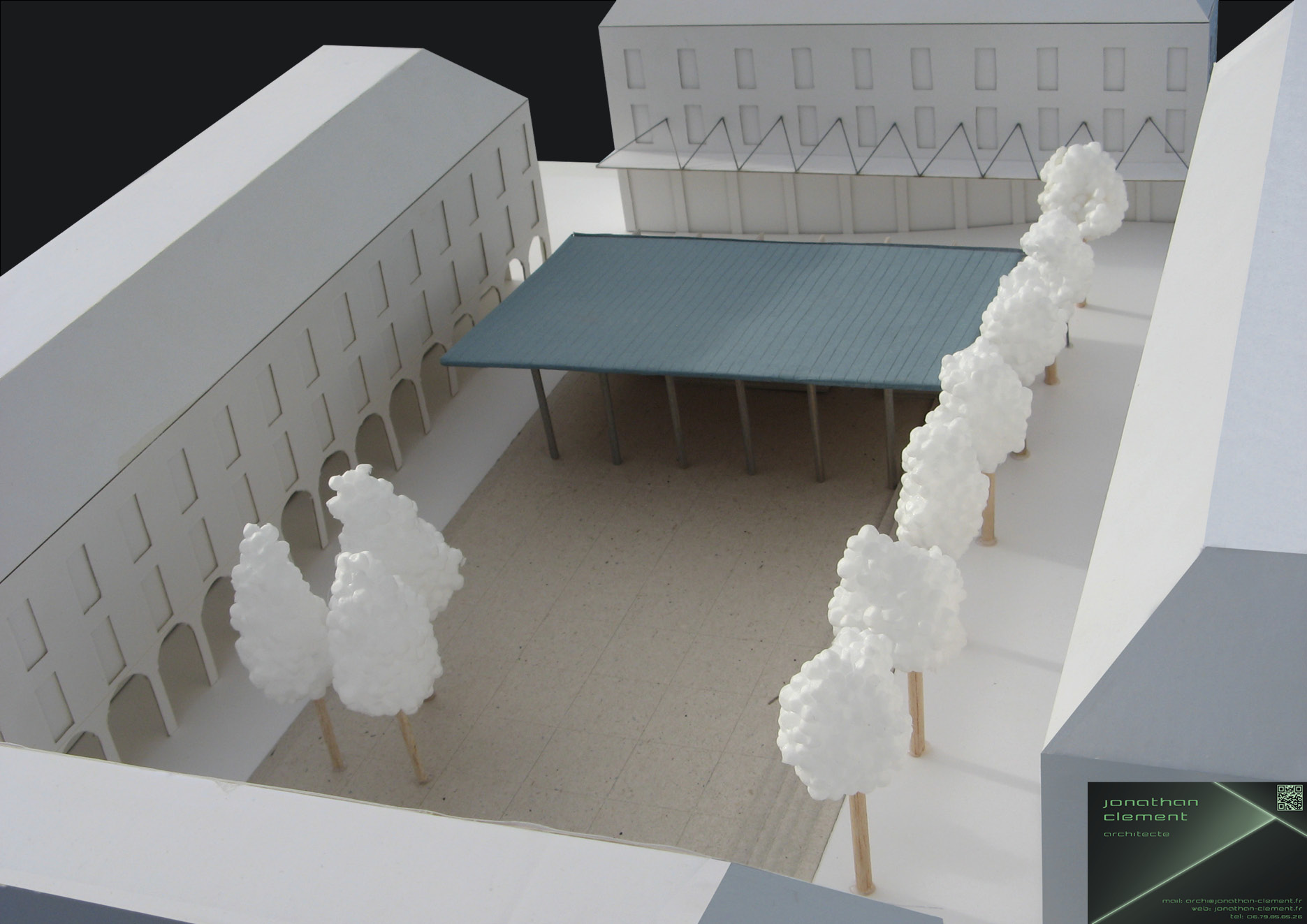 Dans un contexte urbain dense fictif, le projet consistait à réaliser une halle de marché sur une place dans un coeur de ville en devers composée de quatre bâtiments R+2+ comble. L’espace construit et couvert devait pouvoir accueillir un marché de jour comme de nuit ainsi qu’une salle d’exposition provisoire.