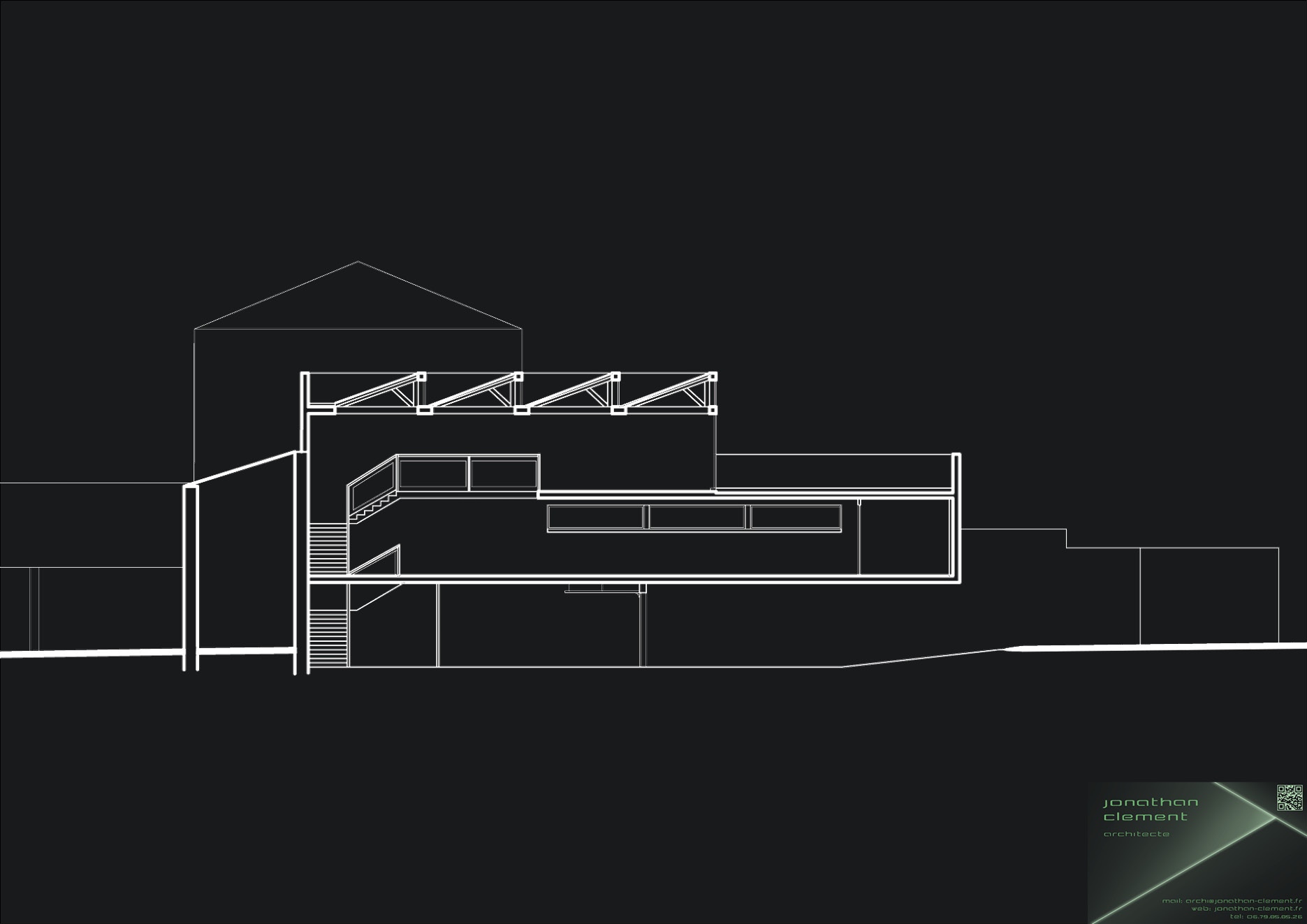 C’est dans cet esprit que cette maison trouve sa volumétrie. Les baies ont été disposées d’une façon à obtenir le maximum de luminosité à l’intérieur des espaces. Un jeu entre les bandeaux horizontaux et verticaux permet une unification des différents volumes suivant leur plan. L’ombre amplifie ce visuel d’intrusion et d’extrusion des volumes. Afin d’optimiser la lumière naturelle dans les espaces principaux, une toiture héritée de l’ère industrielle (shed) a été positionnée face au nord.