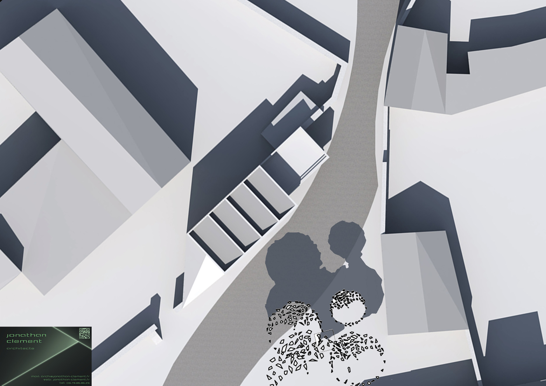 Mon idée a été de partir d’un pavé de la forme du terrain, et d’y réaliser diverses intrusions de vide afin d’obtenir un assemblage de différents pavés représentant chacun un espace de vie lié au programme.