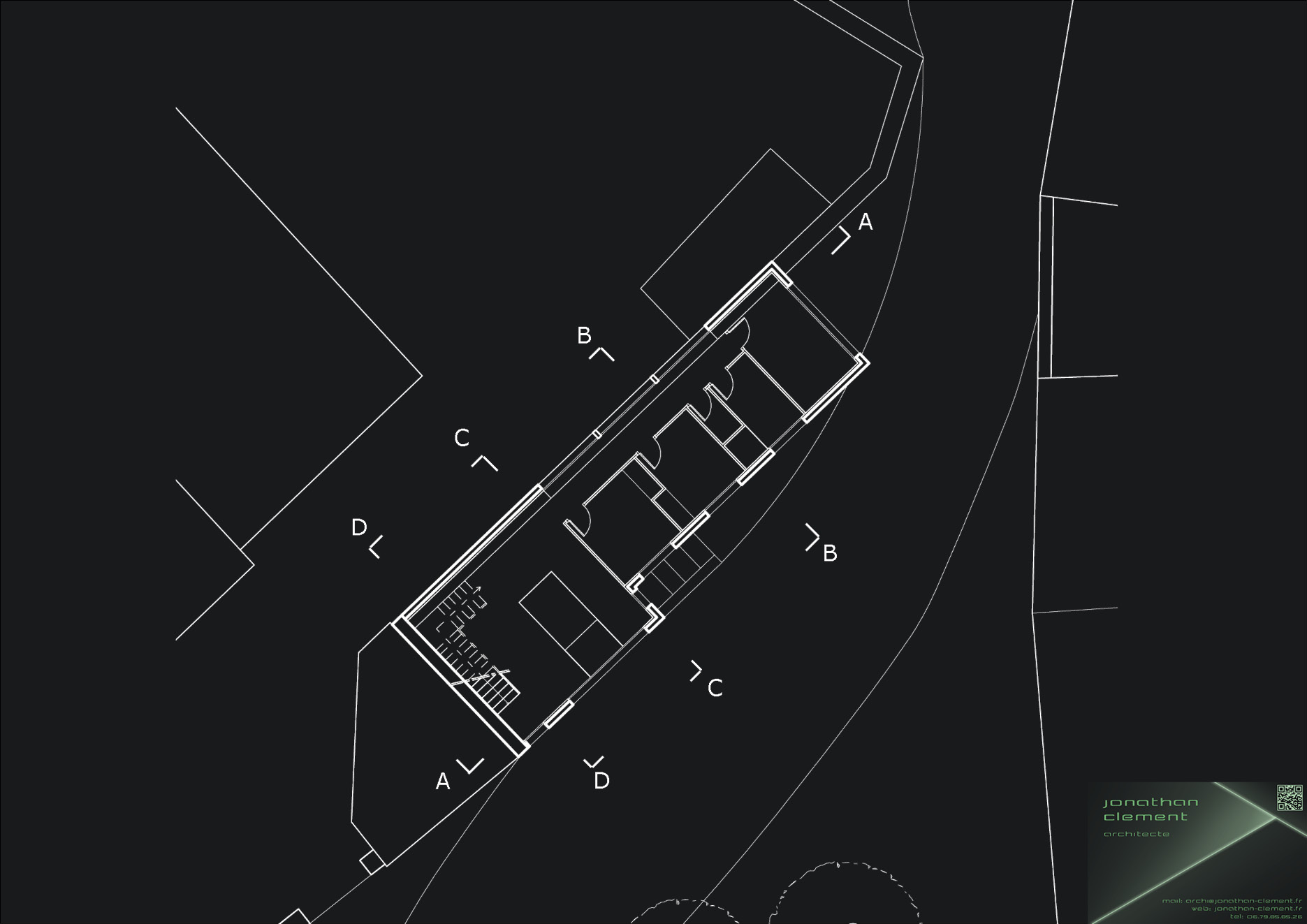 Lors de mon cursus licence à l’Ecole Nationale Supérieure d’Architecture de Saint-Étienne (ENSASE), un projet réel nous a emmené dans un petit village aux alentours de Montbrison (42). Il consistait en la réalisation d’une maison pour une famille composée de deux enfants. L’environnement et le terrain sont assez atypiques. Le terrain est long, étroit et les limites séparatives avec le voisinage au nord et à l’ouest sont constituées de murs très hauts et borgnes et empêchent de créer la moindre ouverture. Cet exercice prend tout son sens dans le contexte actuel où le foncier est de plus en plus cher et rare.