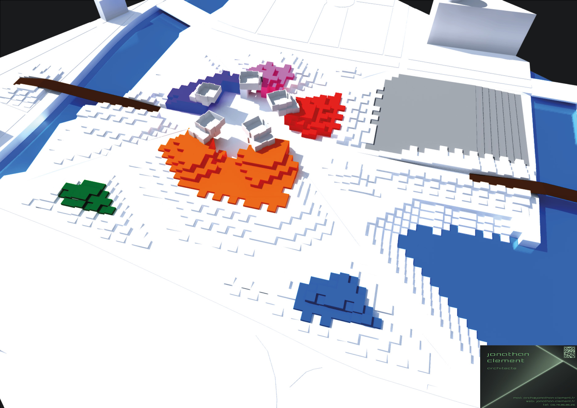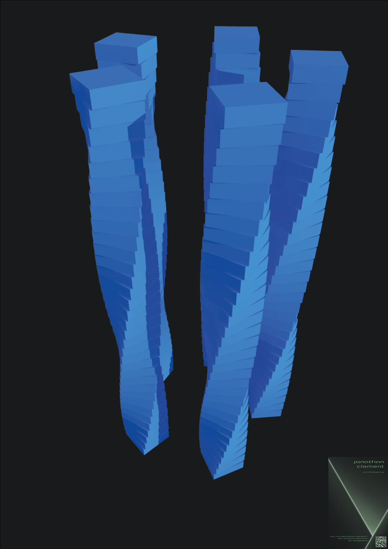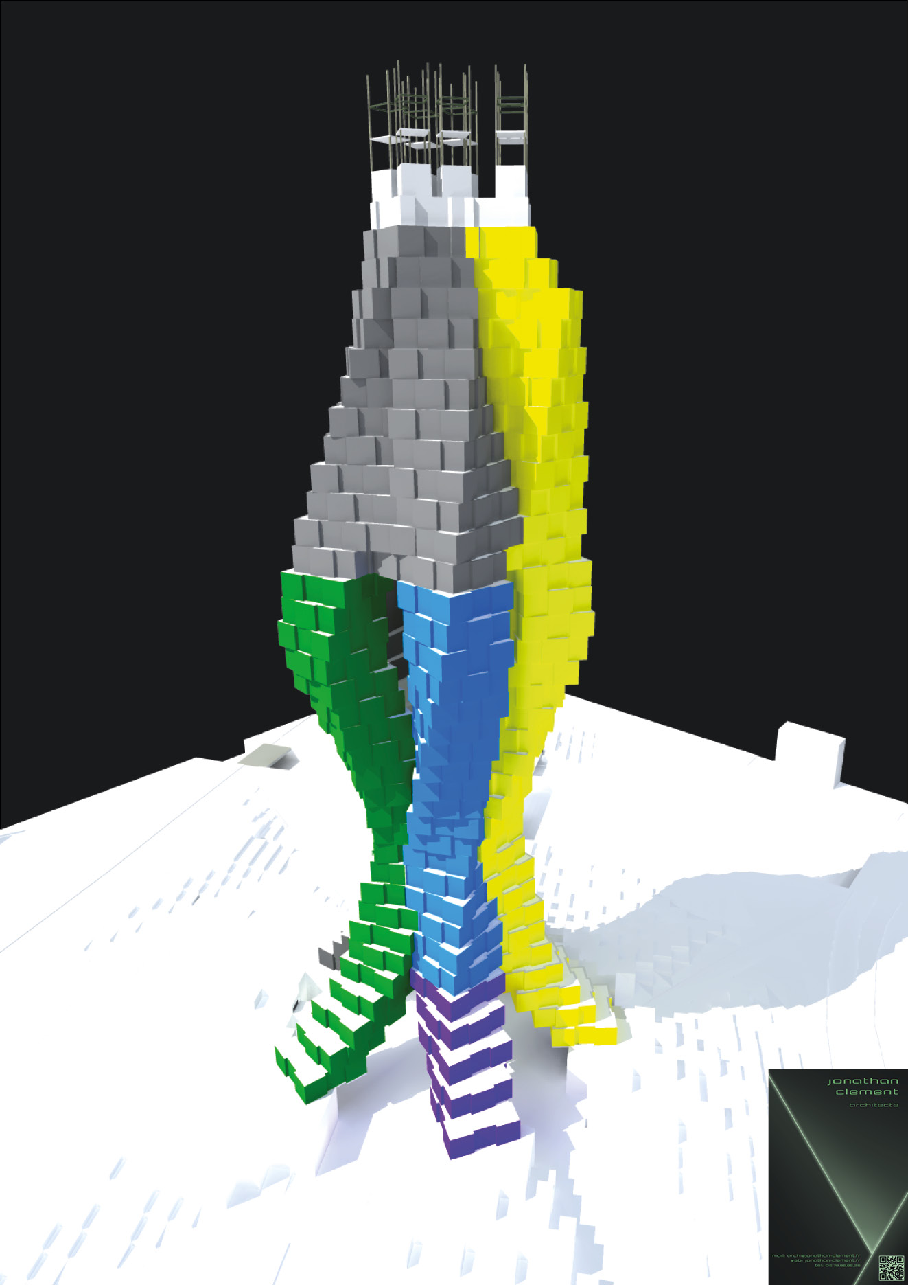 et écrivent un relief sur le territoire pour donner naissance à une tour. Les branches qui constituent ce volume possèdent chacune une donnée du programme. Le mouvement vertical qu’elles produisent permet une mixité des circulations internes sur le plan horizontal. De plus, cela favorise un éclairage naturel au centre de cette tour. Le noyau est de ce fait ouvert et devient un espace de croisement convivial entre les différentes composantes du programme. Ce mouvement est centré sur la circulation verticale qui dessert l’édifice. Afin de créer une qualité spatiale, chaque branche tourne sur elle-même pour que les vues internes que propose l’édifice varient selon chaque étage. Pour créer un aspect vivant à cette tour, la double peau qui compose les parois est équipée de lamelles verticales de ton bleuté dont leurs orientations varient en fonction des besoins des usagers. De ce fait, elle n’offre jamais une vision unique de sa forme et de ses reflets.