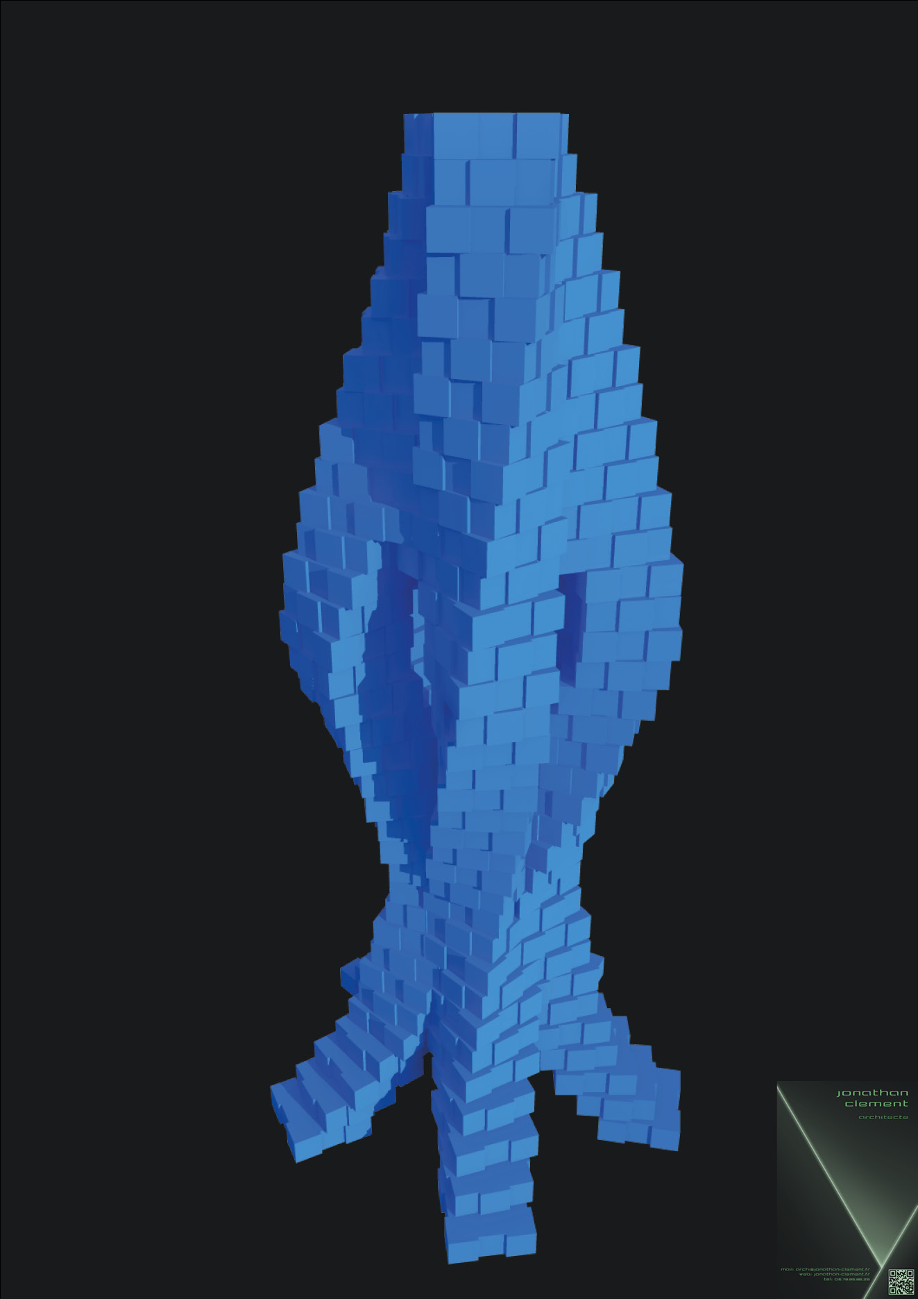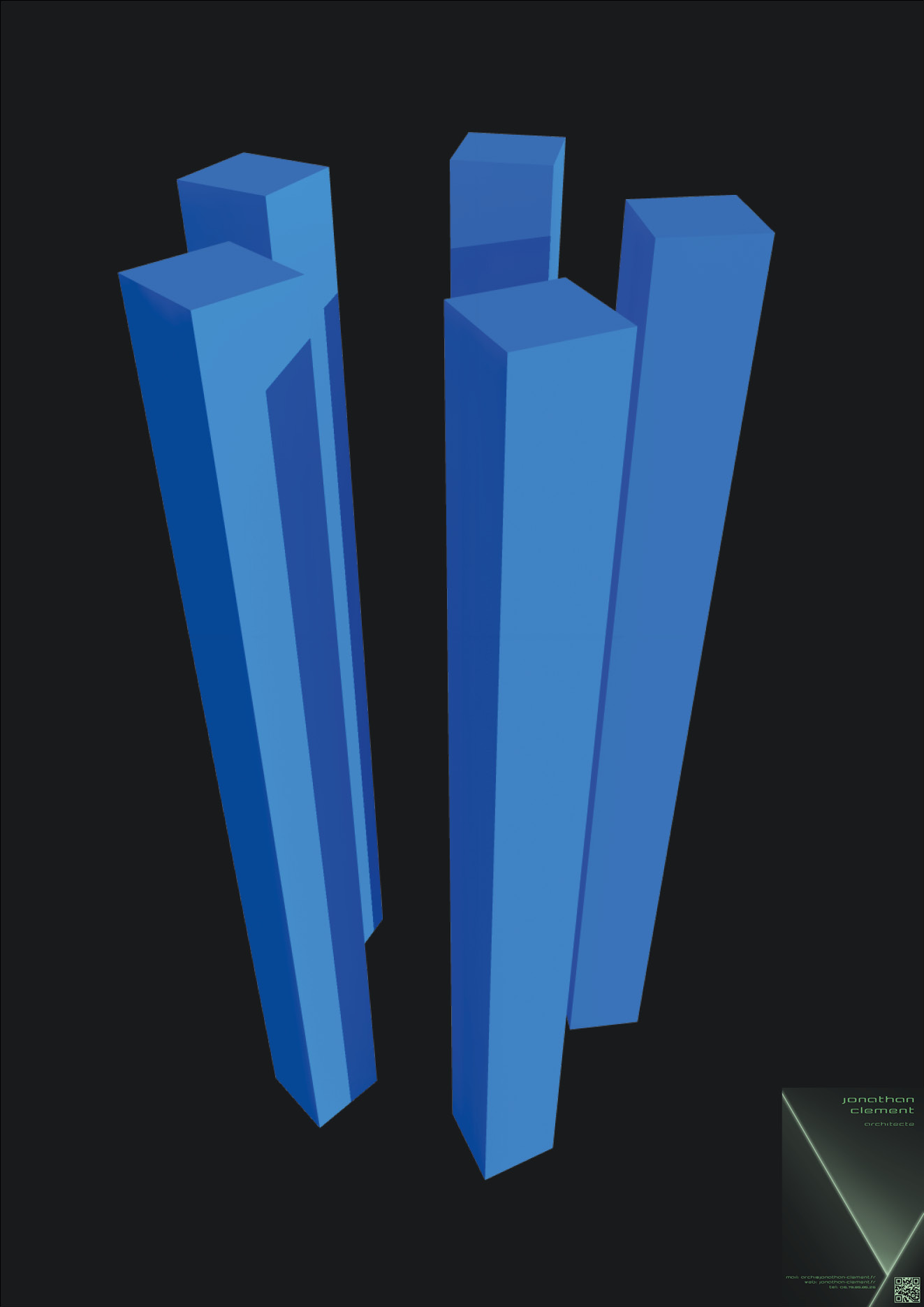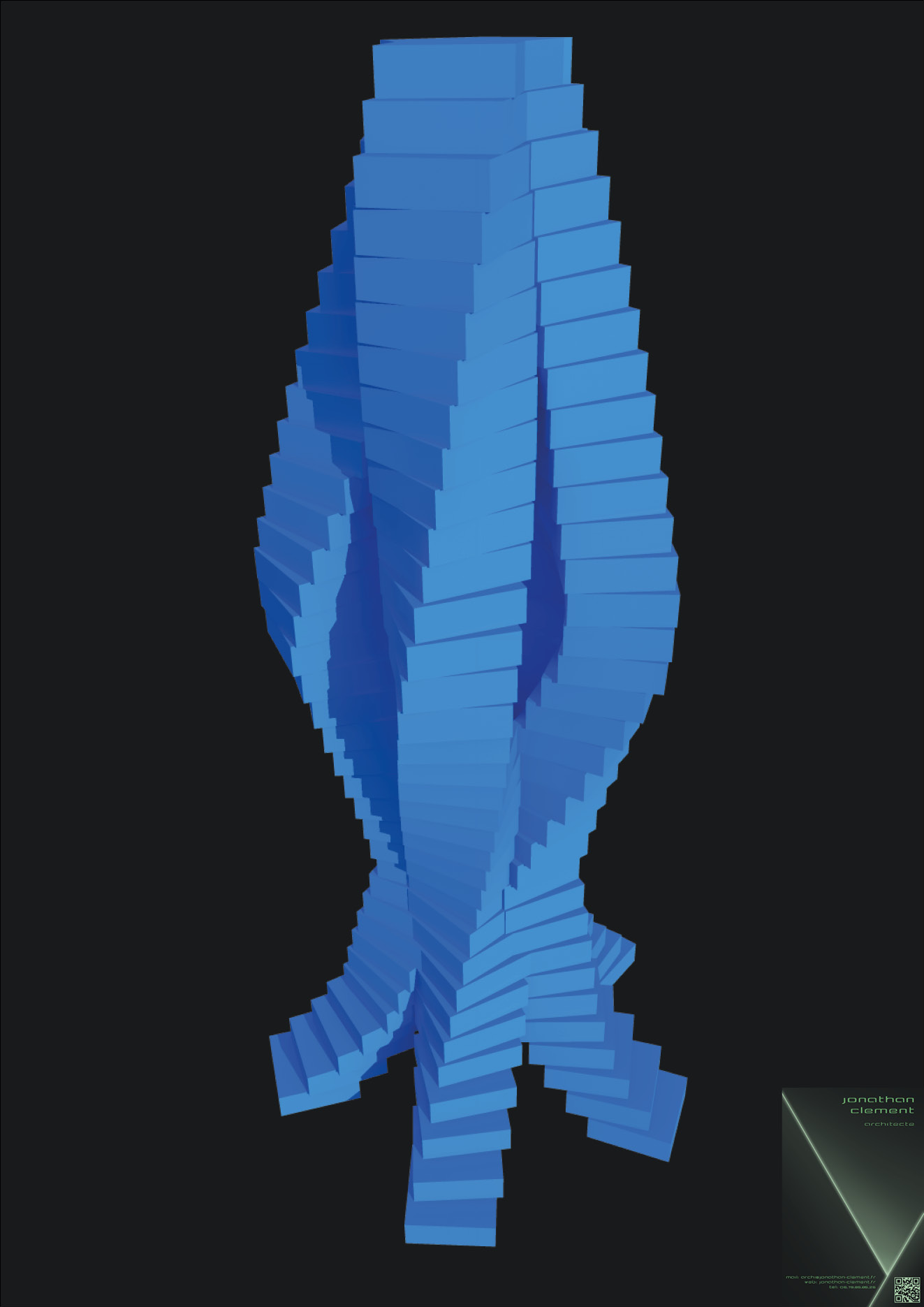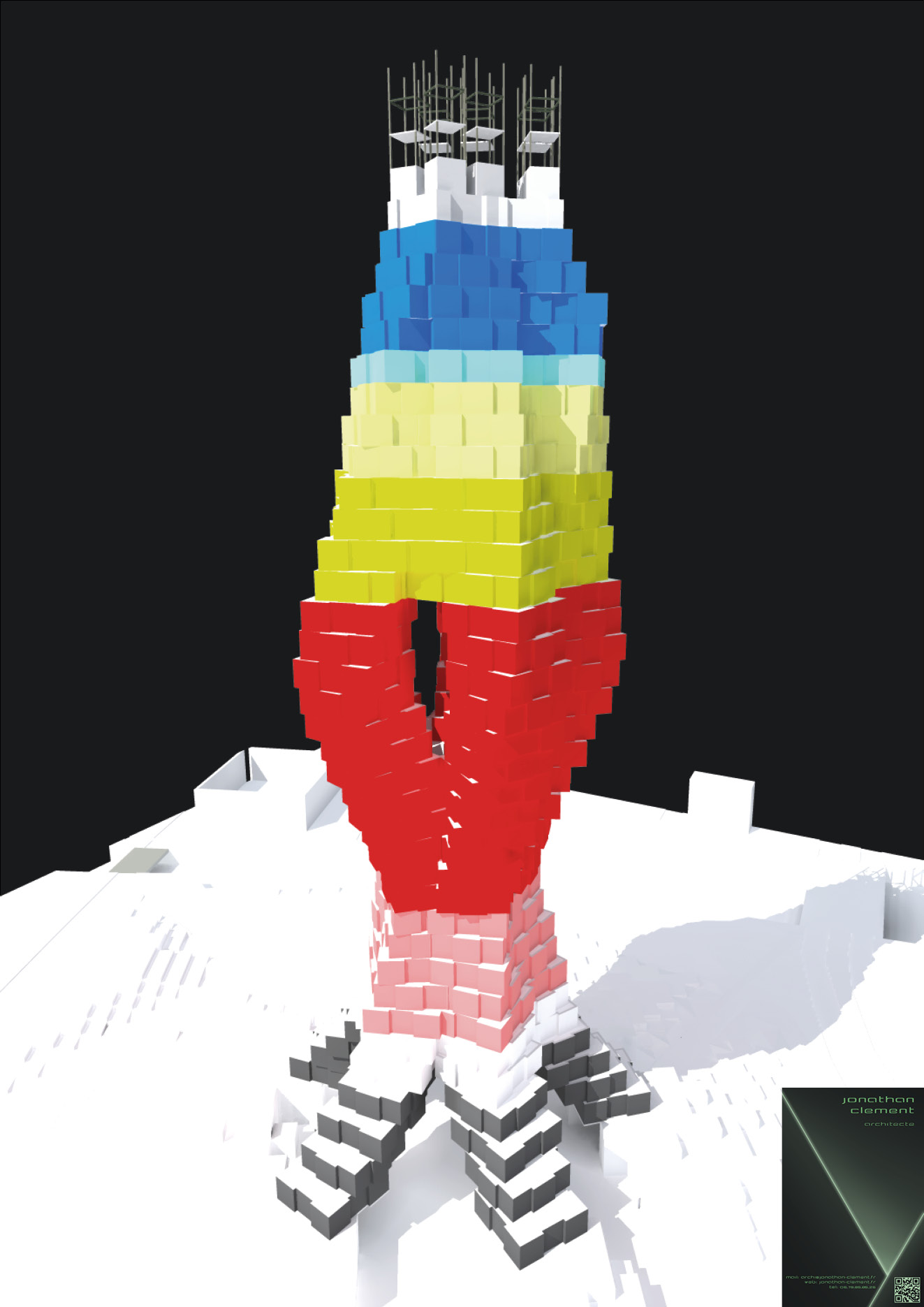 et écrivent un relief sur le territoire pour donner naissance à une tour. Les branches qui constituent ce volume possèdent chacune une donnée du programme. Le mouvement vertical qu’elles produisent permet une mixité des circulations internes sur le plan horizontal. De plus, cela favorise un éclairage naturel au centre de cette tour. Le noyau est de ce fait ouvert et devient un espace de croisement convivial entre les différentes composantes du programme. Ce mouvement est centré sur la circulation verticale qui dessert l’édifice. Afin de créer une qualité spatiale, chaque branche tourne sur elle-même pour que les vues internes que propose l’édifice varient selon chaque étage. Pour créer un aspect vivant à cette tour, la double peau qui compose les parois est équipée de lamelles verticales de ton bleuté dont leurs orientations varient en fonction des besoins des usagers. De ce fait, elle n’offre jamais une vision unique de sa forme et de ses reflets.
