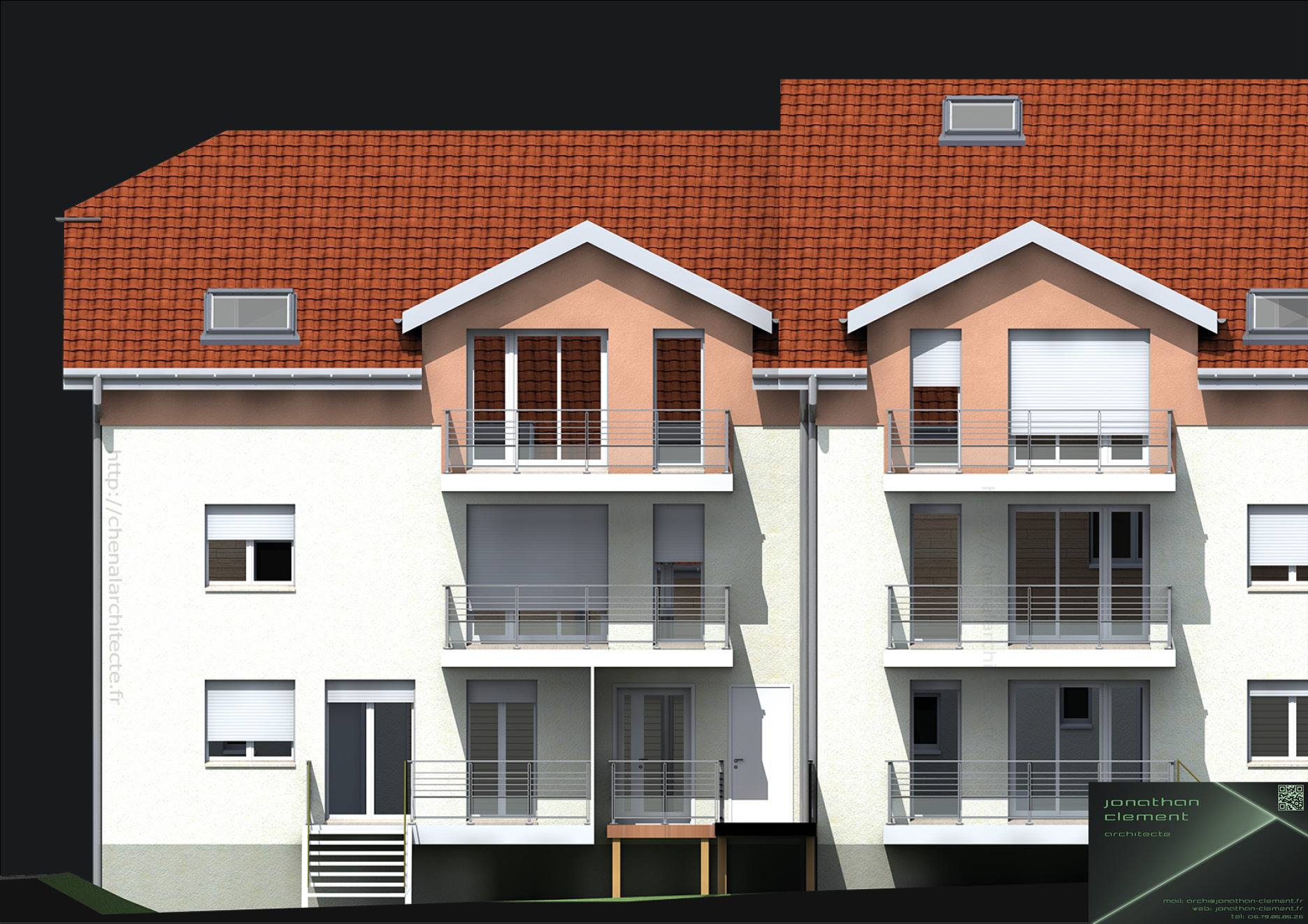 Le langage architectural est volontairement simple et de même nature pour les maisons et le collectif , ce qui pour effet de fédérer l’ensemble et tempérer toute diversité nuisant à une bonne lecture architecturale. Un changement d’échelle est assuré, s’opérant au niveau des groupements de maisons, et non de chaque lot.