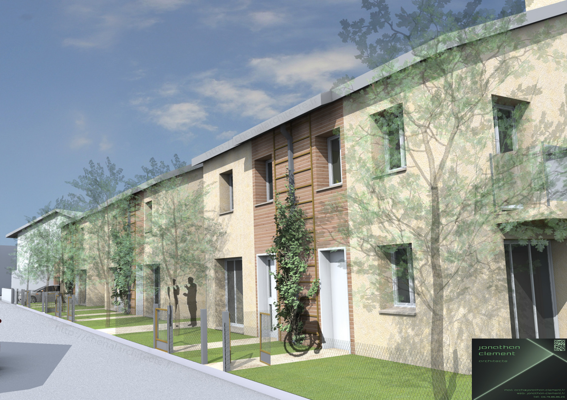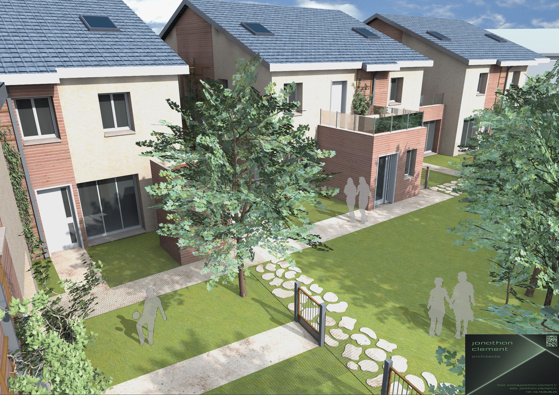 Le projet vise à s’intégrer dans un quartier à forte dominante urbaine pavillonnaire. La conception, l’orientation, et la répartition volumétrique des bâtiments projetés, se rapprochent au mieux de la morphologie urbaine environnante. L’alignement des faitages de trois des bâtiments constitue un volume virtuel assurant une continuité régulière sur rue, se distinguant des trois autres bâtiments, isolés, et en coeur d’ilot, côté sud. Le projet vise à reconstituer ainsi le tissu urbain à l’échelle du quartier.