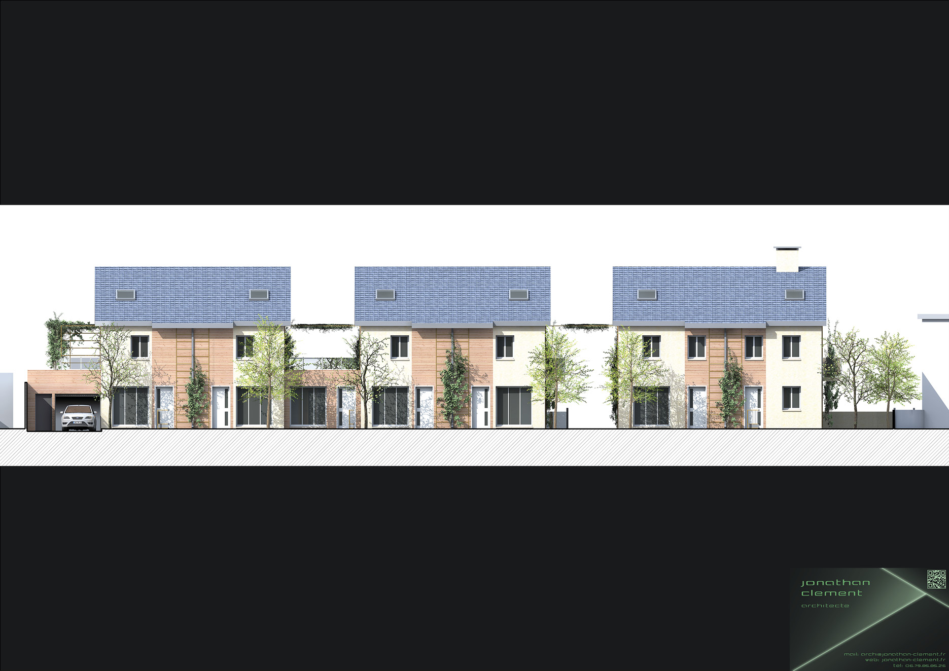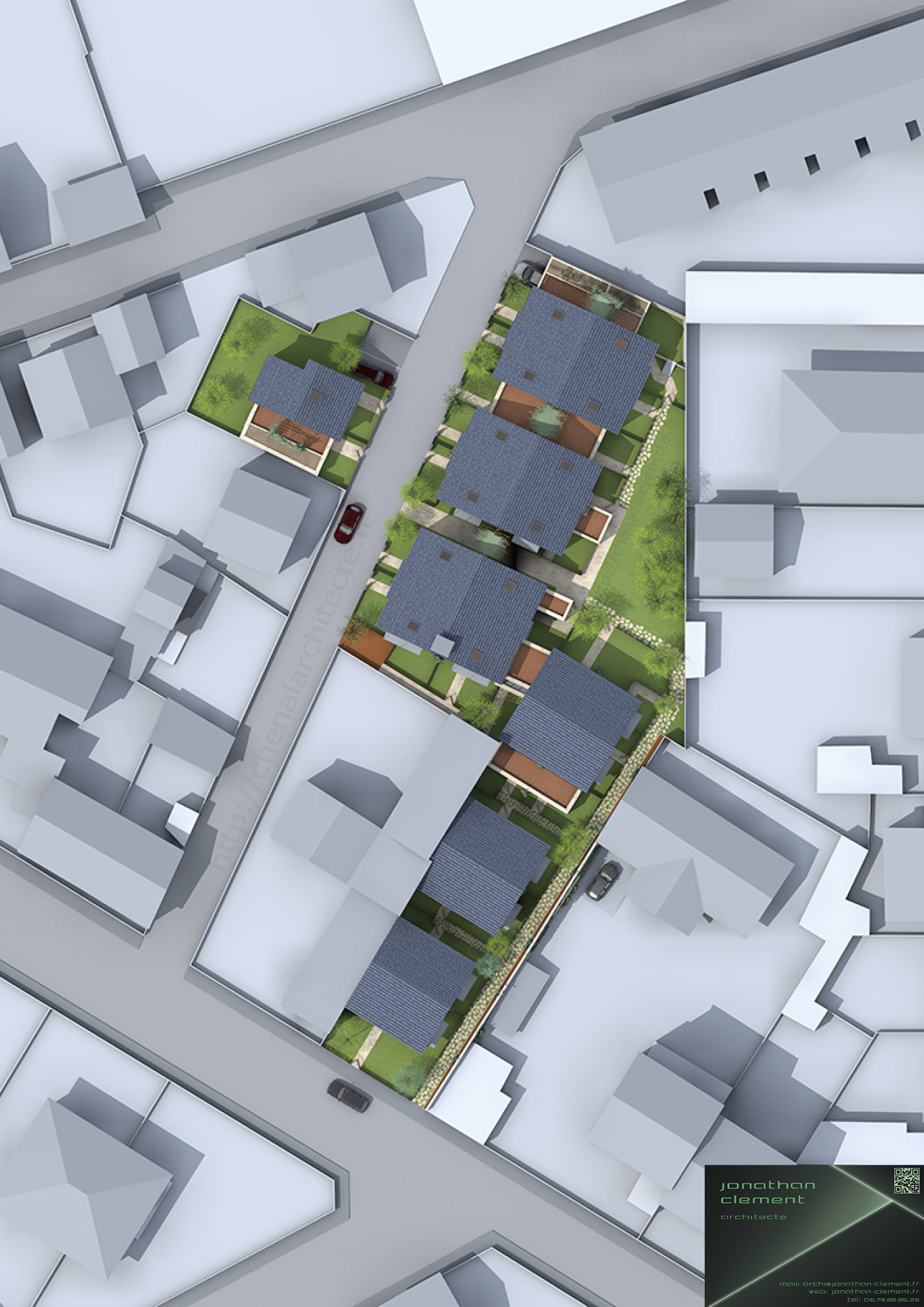 Le projet vise à s’intégrer dans un quartier à forte dominante urbaine pavillonnaire. La conception, l’orientation, et la répartition volumétrique des bâtiments projetés, se rapprochent au mieux de la morphologie urbaine environnante. L’alignement des faitages de trois des bâtiments constitue un volume virtuel assurant une continuité régulière sur rue, se distinguant des trois autres bâtiments, isolés, et en coeur d’ilot, côté sud. Le projet vise à reconstituer ainsi le tissu urbain à l’échelle du quartier.