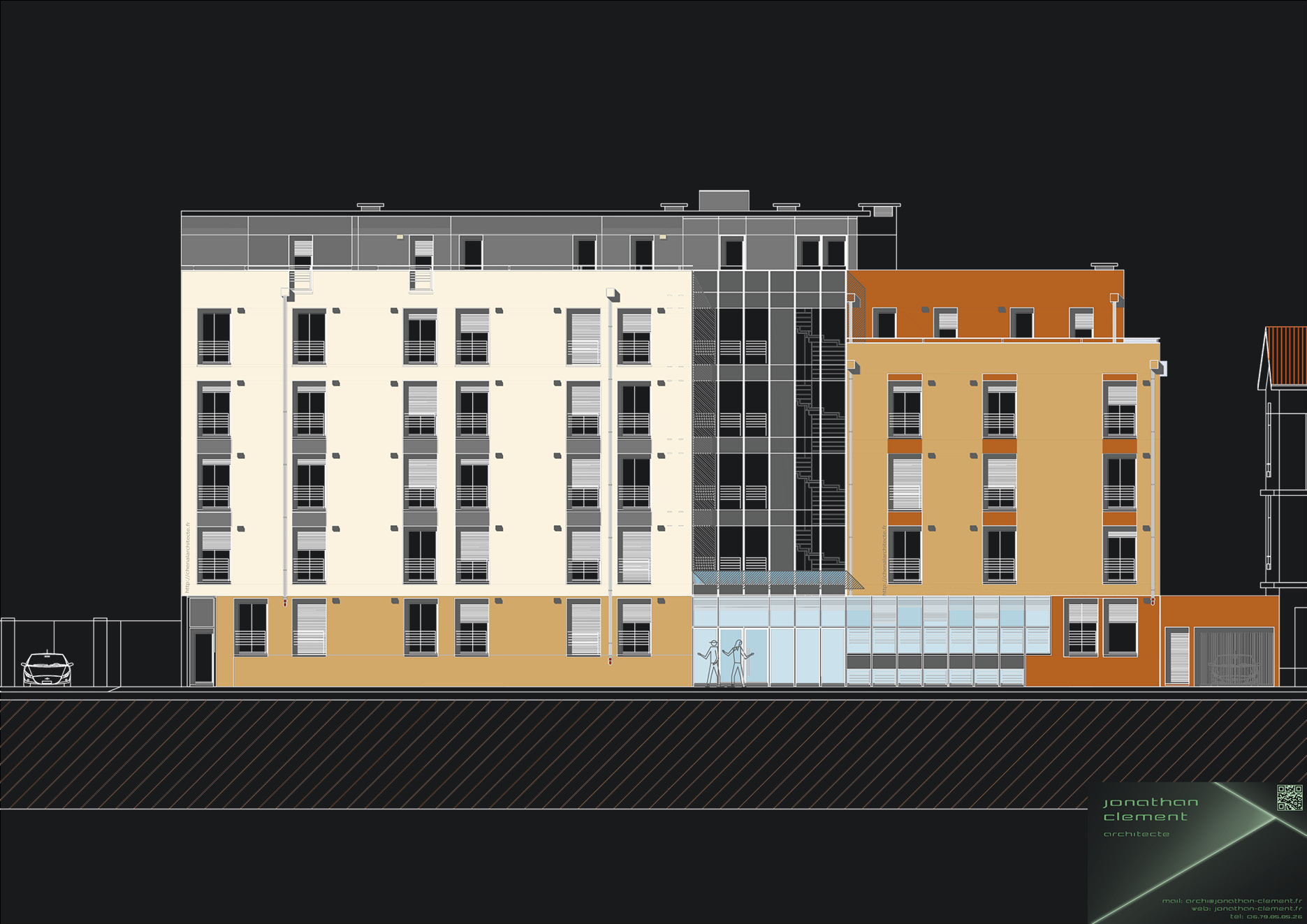 - Les volumétries et le vocabulaire architectural sont volontairement simples pour permettre une bonne intégration au bâti existant. La typologie des ouvertures reflète la fonction rationnelle d’hébergement ou de service. L’unité dimensionnelle traduit l’exigence fonctionnelle de vue extérieure et d’éclairage naturel pour les logements accessibles aux handicapés. Une marquise de métal et verre ponctue la façade, tout en marquant l’entrée principale du bâtiment sur la rue Jules Valès.