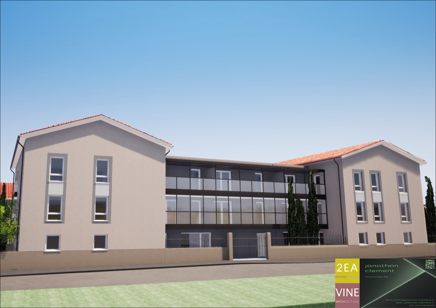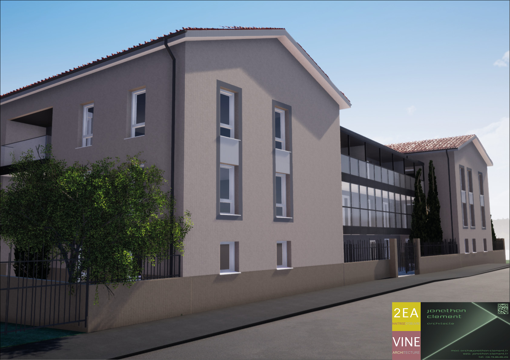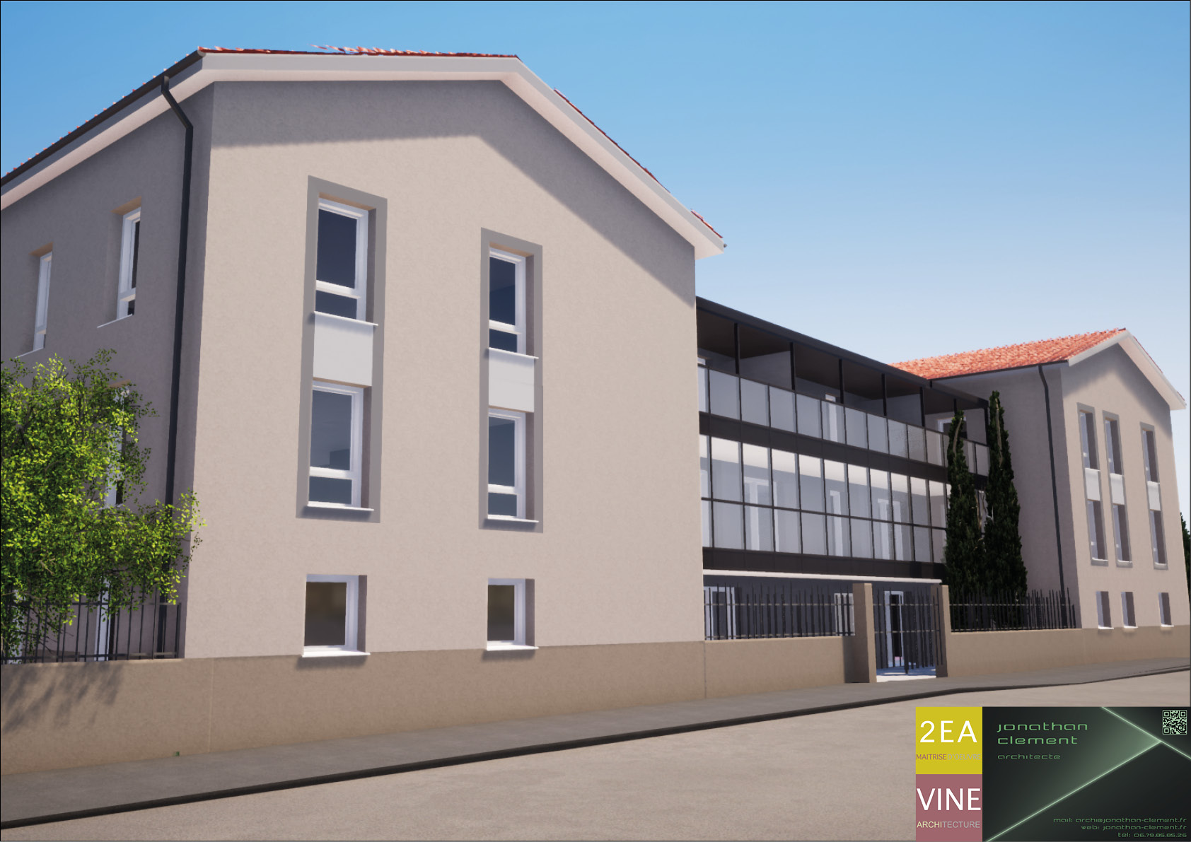 Le projet s’articule autour de trois corps de bâtiments simples, en R+2, aux ouvertures rythmées et aux proportions traditionnelles. Ils sont reliés par un corps de bâtiment plus contemporain qui vient s’adapter à la déclivité du terrain. De cette manière, les toitures sont contraintes à une hauteur de 11m en tout point de la construction par rapport au terrain d ’origine.