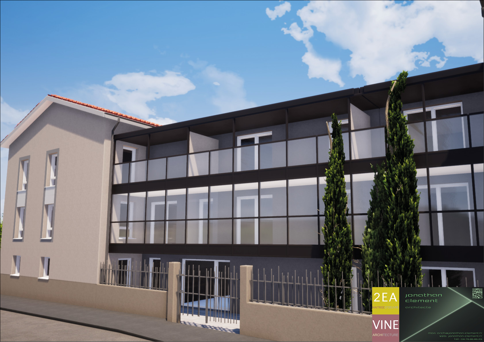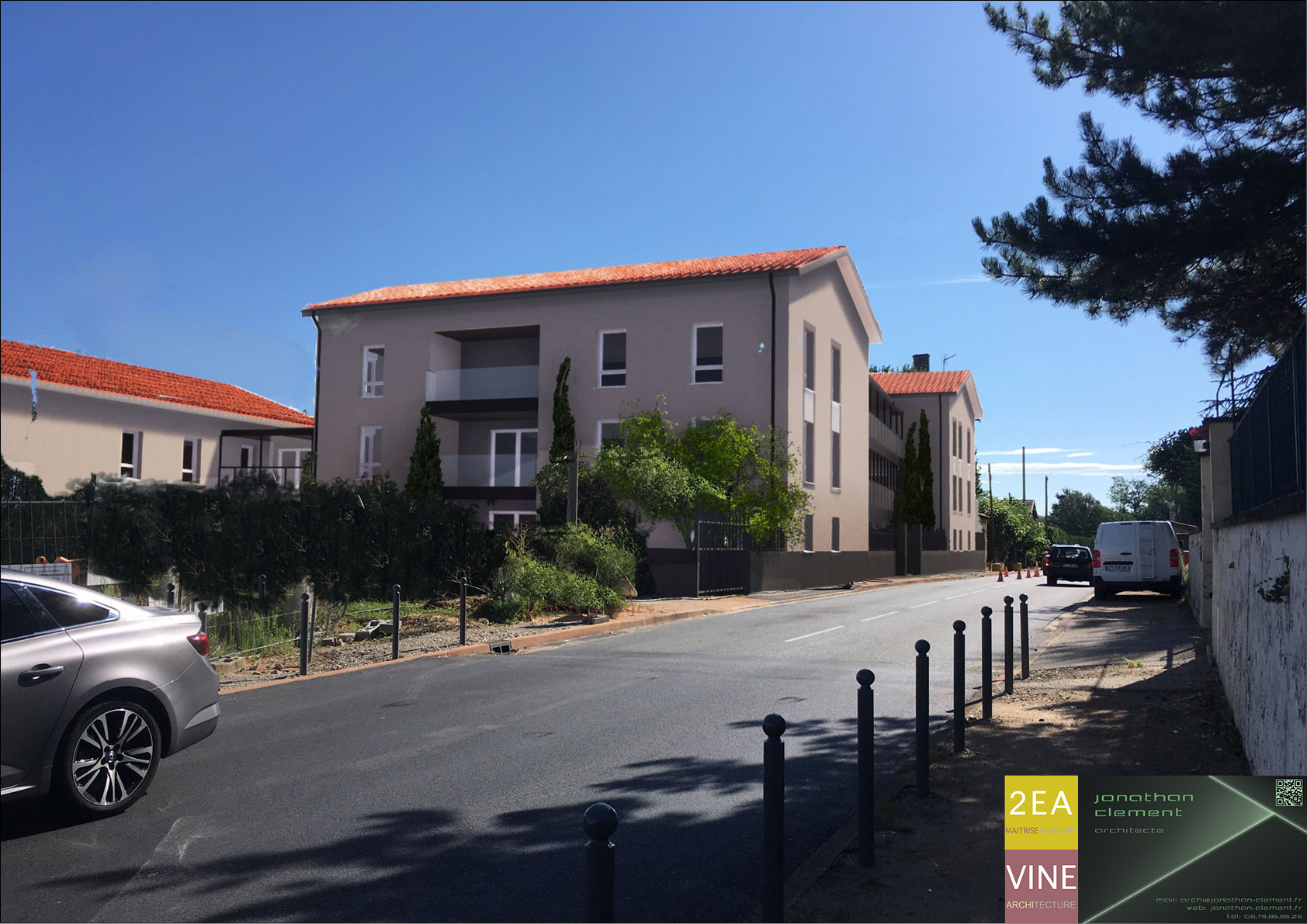 En front de rue, les deux corps d ’architecture traditionnelle sont positionnés perpendiculairement à la rue et recouvert d’une toiture 2 pans. Ils sont reliés par un volume plus contemporain, toit -terrasse, en retrait, doublé d ’une double peau en serrurerie abritant les balcons et coursives. Cette disposition libère ainsi la perception des pignons sur le front de rue pour une meilleure insertion dans le tissu urbain environnant.