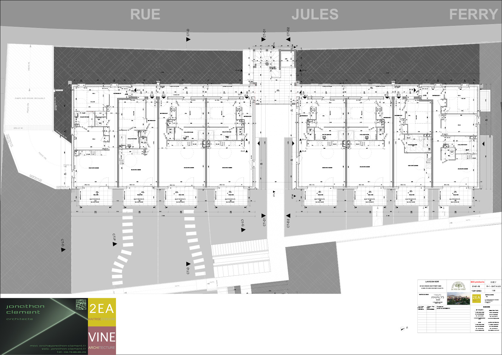 Le parti architectural a été de venir s’aligner parallèlement à la rue Jules Ferry et en limite de la rue Grisard conformément à la trame urbaine dominante, un jeu de miroir morcelé avec les bâtiments en R+3 et R+4 en face de la rue grisard.